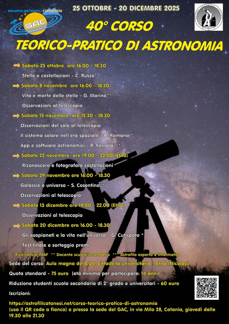 Il Corso si svolgerà presso l'aula magna del CUS alla Cittadella Universitaria. Due lezioni pratiche in una località con cielo buio nei pressi di Nicolosi. Saranno accettate iscrizioni fino al raggiungimento dei posti disponibili in aula.