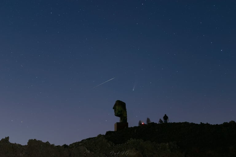 Tramonto della cometa C/2025 A6 (Lemmon) sull’installazione artistica del Teseo screpolato posta sul monte Etna.
