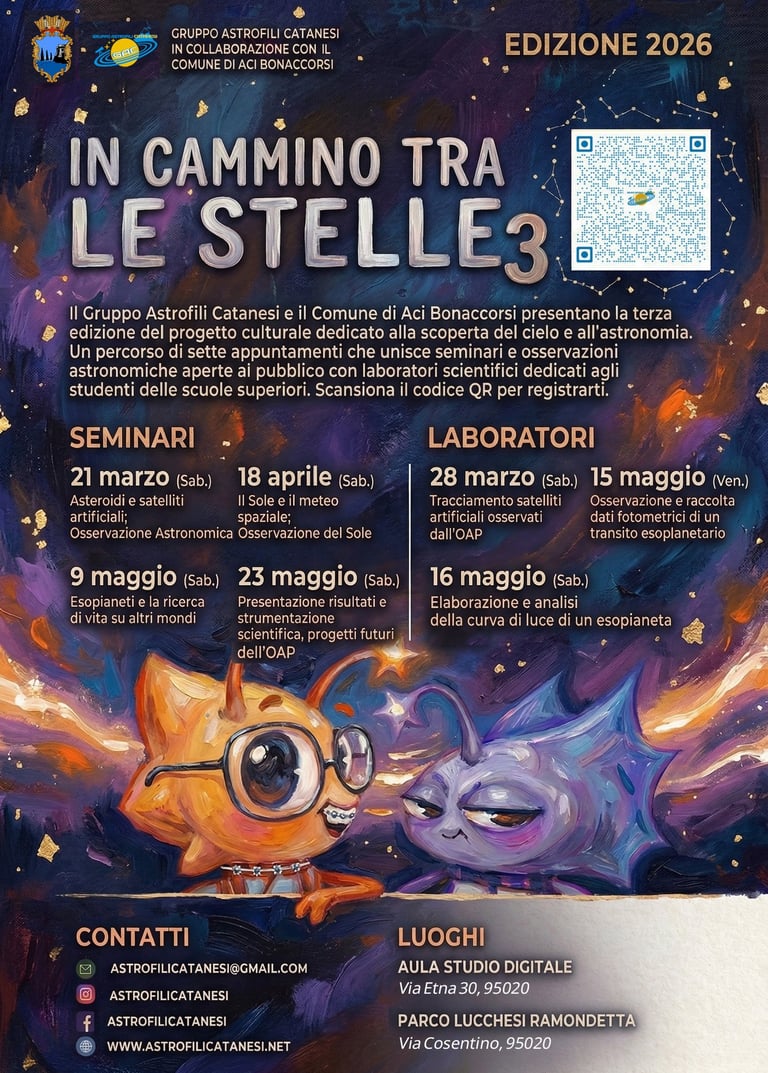 “In cammino tra le Stelle” è un progetto che nasce con l’obiettivo di avvicinare giovani e famiglie al mondo dell’astronomia e delle discipline scientifiche, in quanto parti fondanti della nostra cultura e del pensiero umano. Dopo il grande successo delle prime due edizioni dedicate ai più piccoli, il progetto organizzato dal Gruppo Astrofili Catanesi (GAC) e dal Comune di Aci Bonaccorsi si evolve in un ciclo di incontri aperti a tutta la cittadinanza, accompagnato da attività pratiche rivolte agli studenti delle scuole superiori.